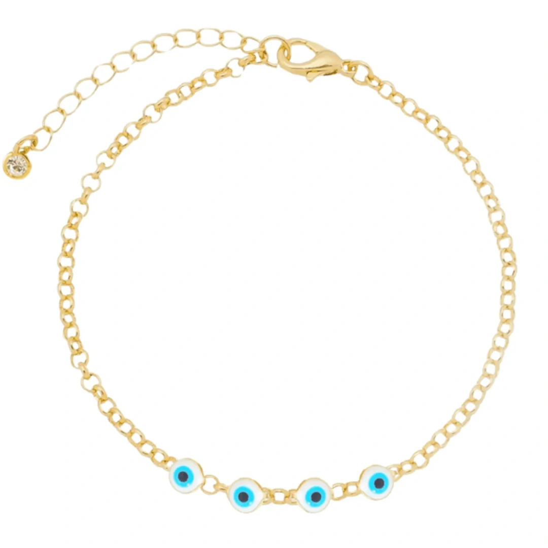 Com design delicado e acabamento suave e brilhante, esta tornozeleira reflete a luz com elegância. Os elos se unem ao pingente de olho grego — símbolo de proteção e boas energias — criando uma peça moderna e cheia de significado.