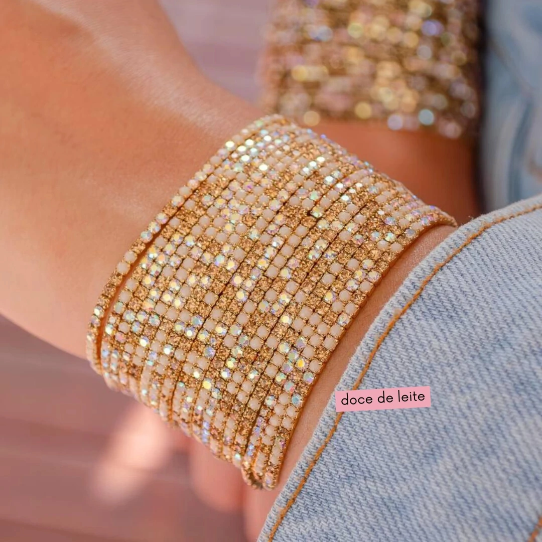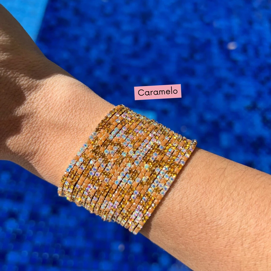 12 Pulseiras Riviera de Elástico Doce de Leite — cor clássica e delicada, com elástico resistente e brilho intenso.
