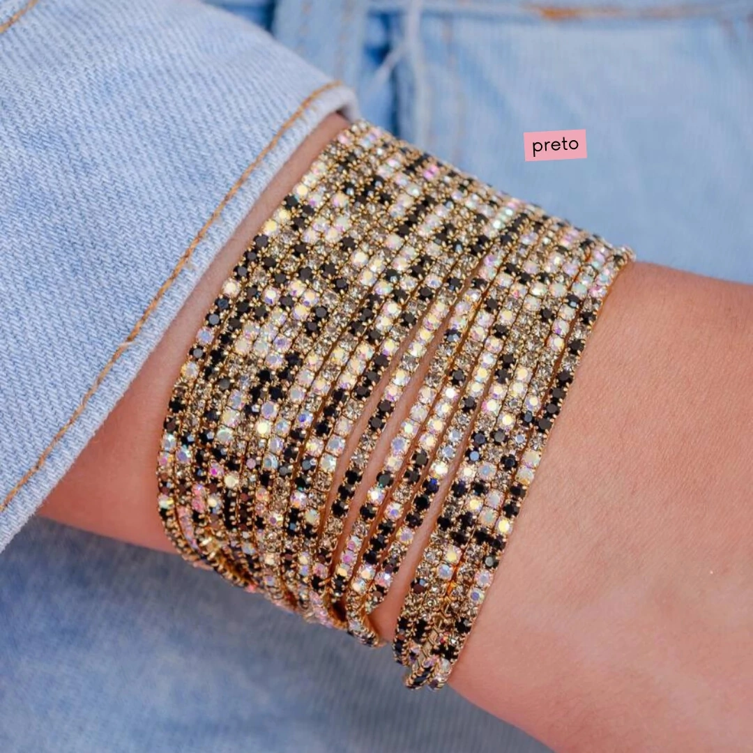 12 Pulseiras Riviera de Elástico Pretas — elegância atemporal com aquele contraste que valoriza qualquer mix.
