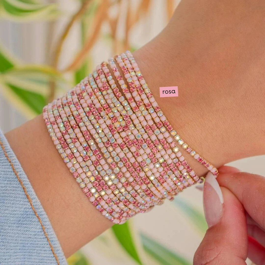 12 Pulseiras Riviera de Elástico Rosa — elegância atemporal com aquele contraste que valoriza qualquer mix.