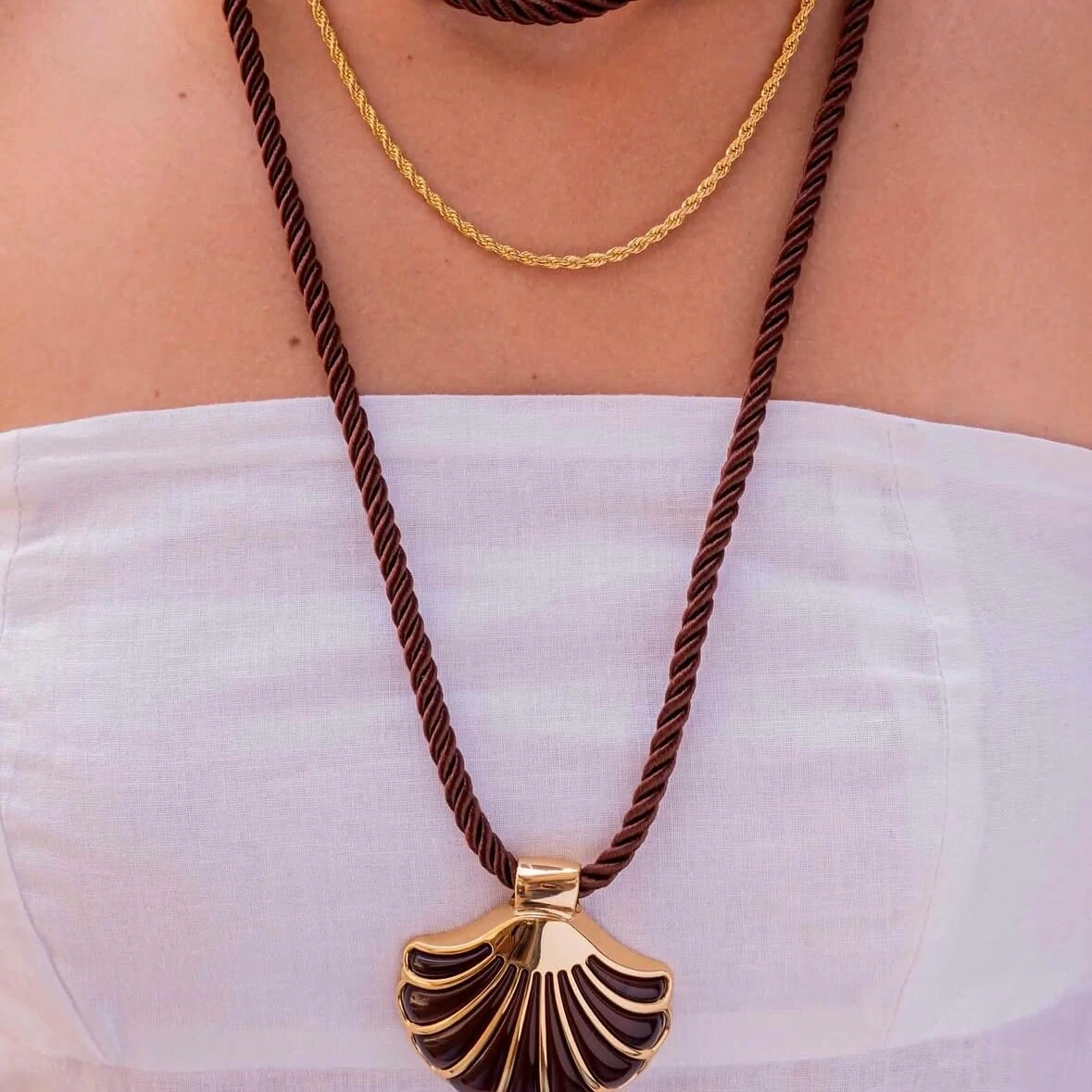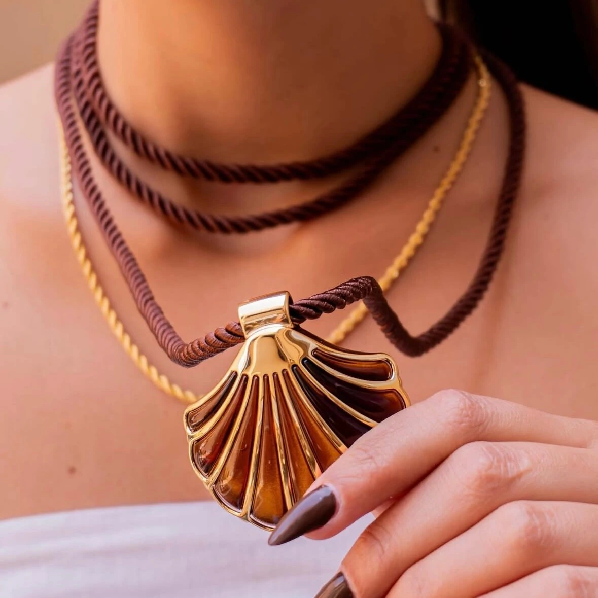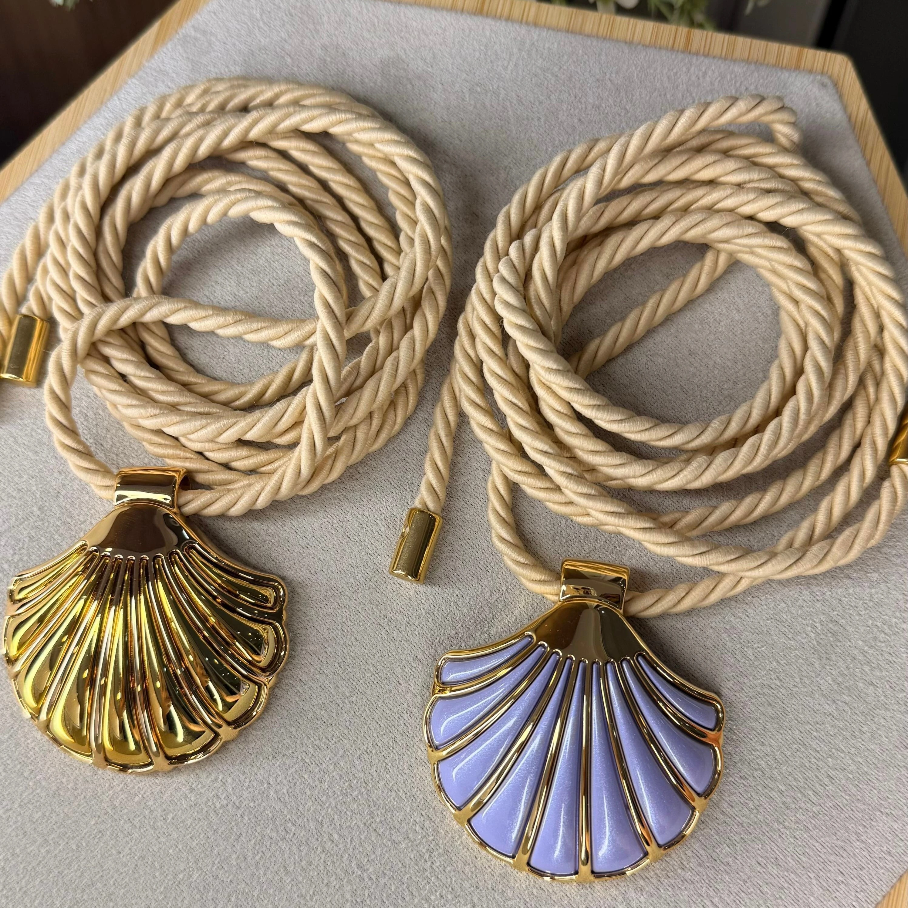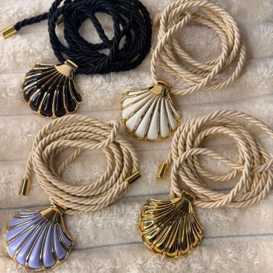 Feito em cordão de amarração, tendência forte da estação — e o brilho delicado do pingente de concha dourado, que remete ao verão e à energia do mar.