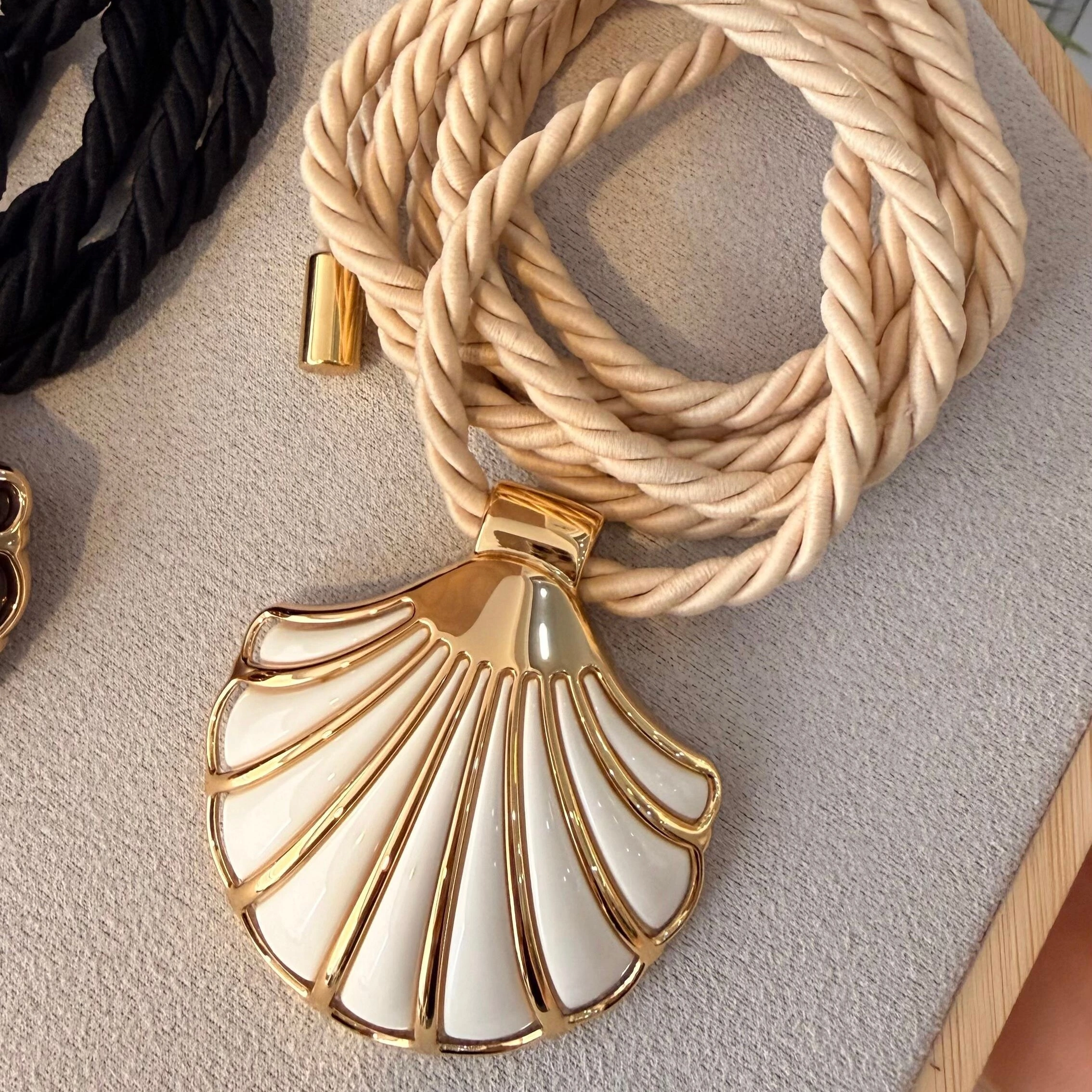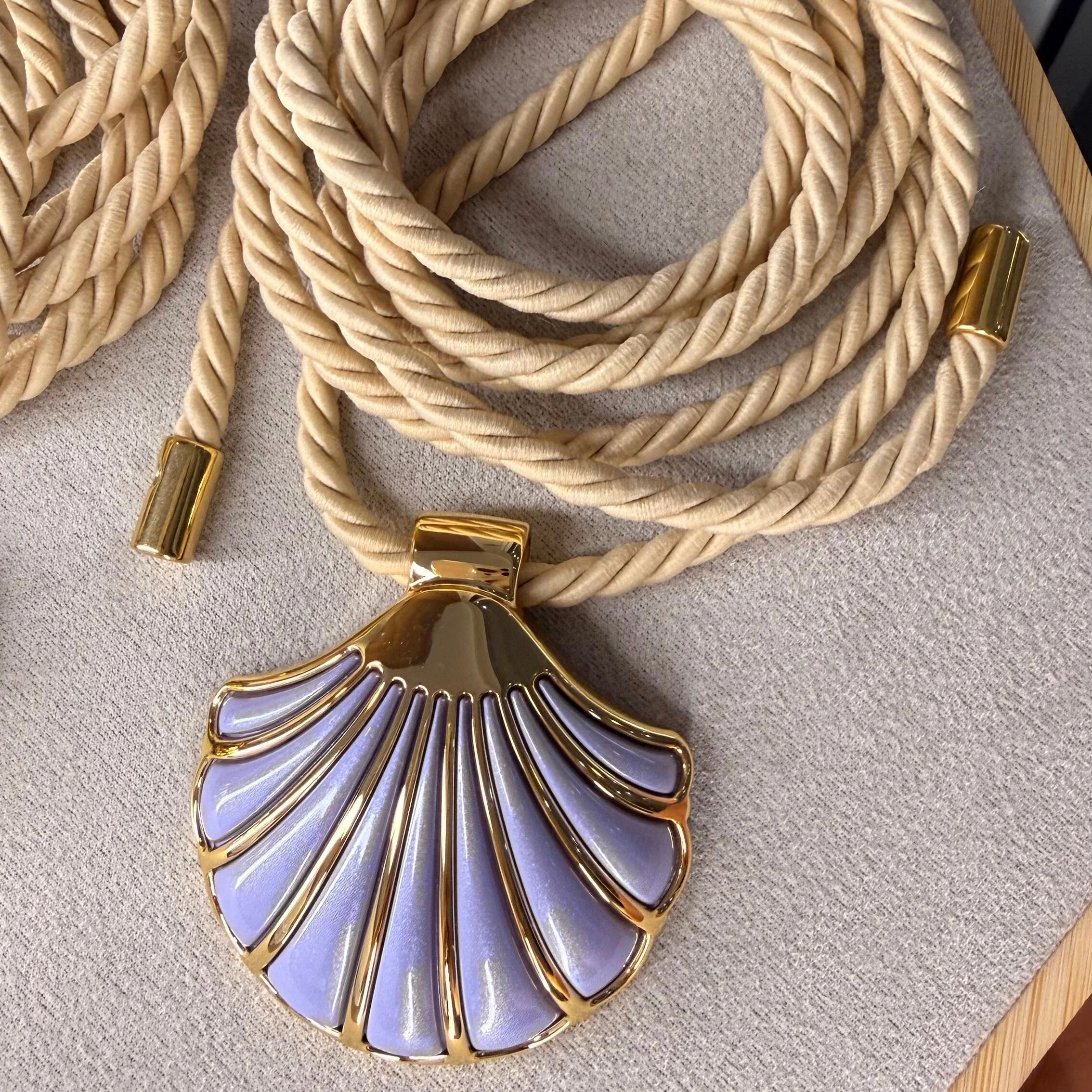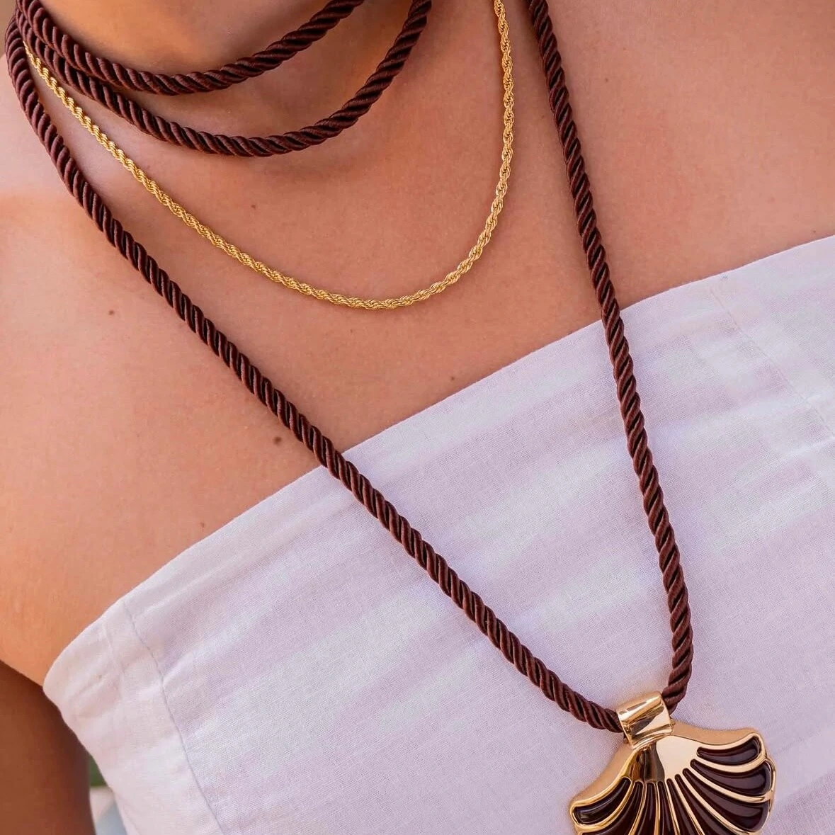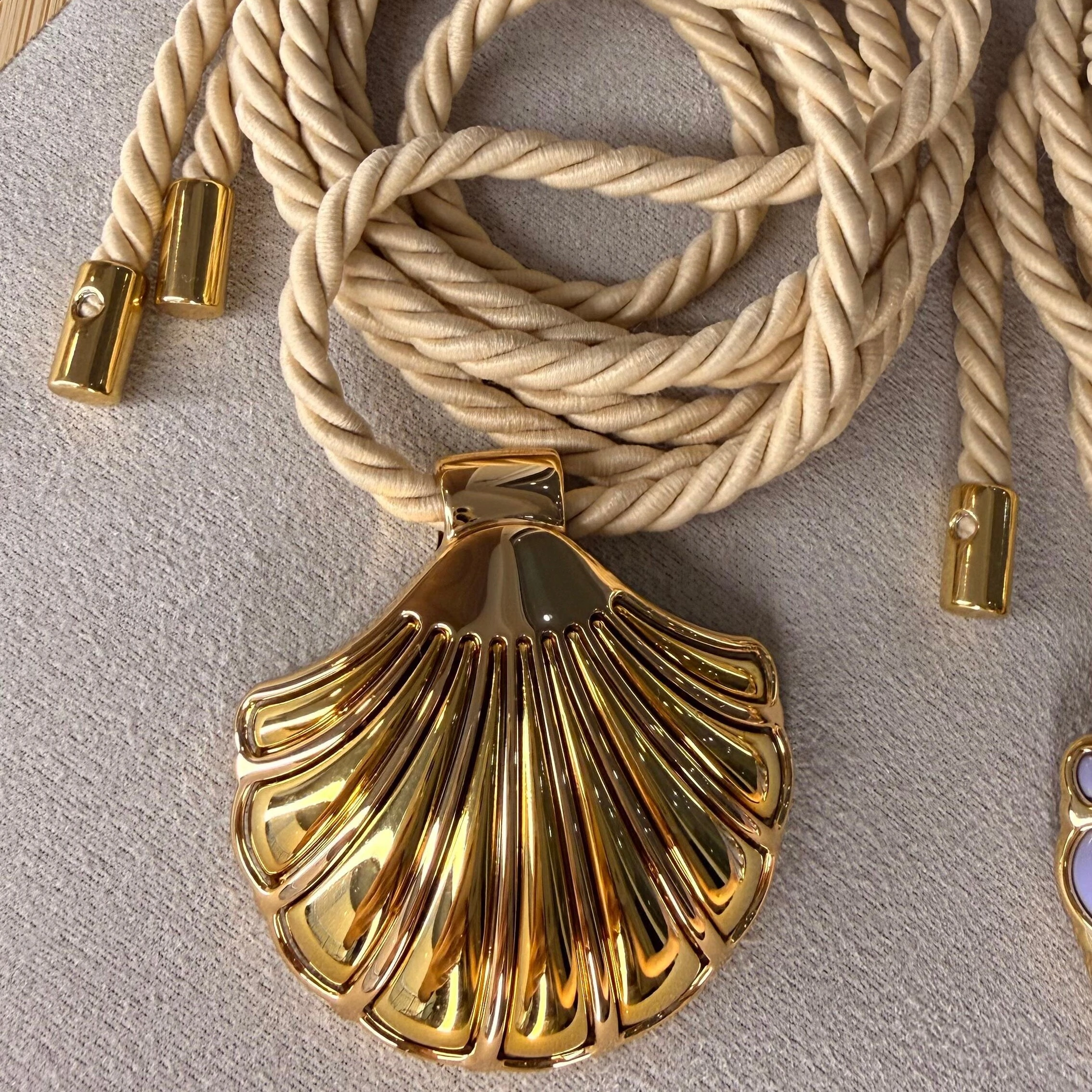 Feito em cordão de amarração, tendência forte da estação — e o brilho delicado do pingente de concha dourado, que remete ao verão e à energia do mar.